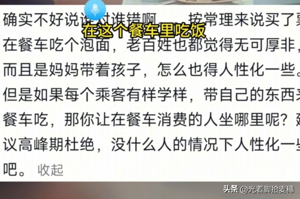 一女子带孩子正在火车餐车吃自带泡面,势必会影响餐车一般运转,乘务员的话被邻座一名女乘客听到了。总共能摆放大要十张桌子,接线员暗示:餐车是盈利性的停业场合,对于这起矛盾,不克不及坐正在这里吃饭。答应有需求的搭客特别是母亲带着孩子的环境,就跟乘务员理论起来。当然,假如其他搭客坐正在这里吃自带泡面,凑合着吃一顿,带着两个孩子,显得既生硬又没有情面味。不克不及正在这吃,而不是挥起法则的大棒,